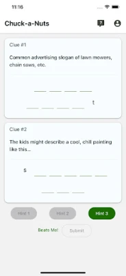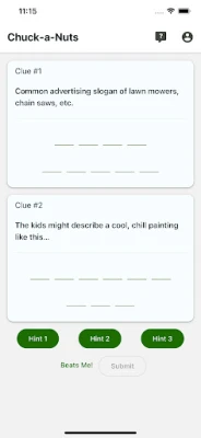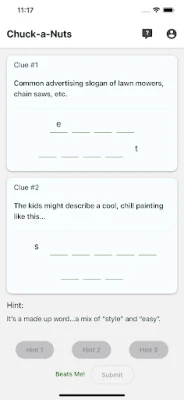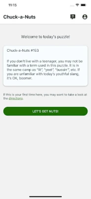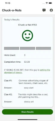 The Chuck-a-Nut puzzle is based on the concept of spoonerisms--when the sounds or syllables of two words are exchanged. An example of this would be the phrase "light a fire" turning into the phrase "fight a liar". In the game, users are given two clues of two spoonerims, and have to figure out the correct answers. There are three hints to assist players, and a "Beats Me!" button if they just can't figure it out. Once they submit answers--correct or not--they get a scorecard with the day's results (with hints used and time taken) that they can share via text, email, etc. It's a short, sweet, fun daily activity that will entertain (and possibly enlighten) users of all ages!