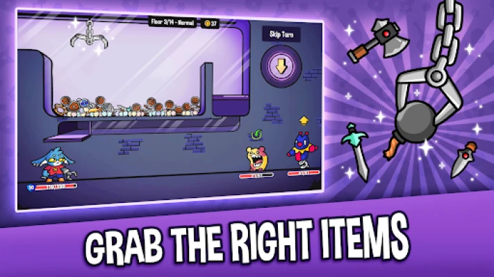 Use a claw machine to grab weapons, shields, and items as you navigate the dungeon packed with enemies and treasures. Get ready for a thrilling journey where your strategy and skill will be tested!