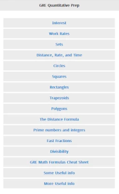 # Interest # Work Rates # Sets # Distance, Rate, and Time # Circles # Squares # Rectangles # Trapezoids # Polygons # The Distance Formula # Prime numbers and integers # Fast Fractions # Divisibility # GRE Math Formulas Cheat Sheet # Some Useful info # More Useful info