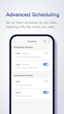 Set multiple schedules from hourly to daily to weekly, hitting different rooms with each one. You can clean the kitchen after breakfast and even the whole house when everyone's gone out.