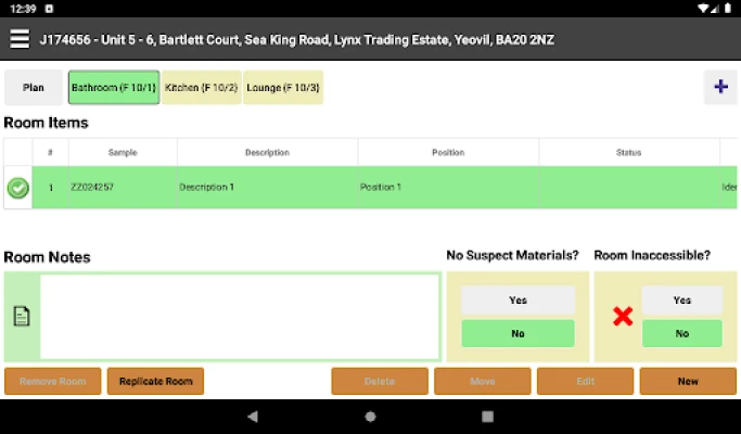 The TEAMS floorplan designer is also integrated into TEAMS Asbestos app to allow the surveyor to create the areas in real time onscreen and simply drag and drop the samples onto the canvas. The floorplan facility also supports;